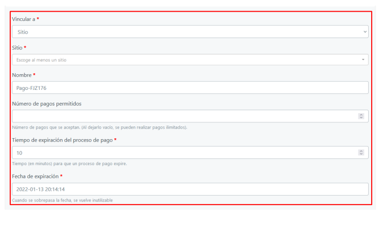 Sitio: Se selecciona el nombre del sitio al que se va a vincular el link de pago que se está creando.