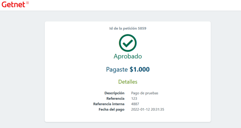Cuando el usuario hace clic en proceder con el pago, es redireccionado a Ecommerce de Getnet, una vez realiza el pago, se le presenta al usuario el estado de este