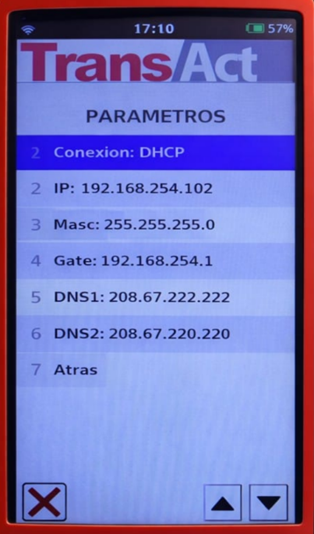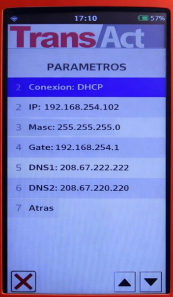 Una vez hecho esto, vamos a ver que en los parámetros ya se cambió el tipo de conexión (Opción 1), y podemos ver el resto de los parámetros, entre ellos la IP, Máscara de red, Gateway, y los DNS, y en caso de requerirlo, podemos modificarlos a mano. Tener en cuenta que si se necesita colocar un numero de dos dígitos, por ejemplo 55, se debe colocar 055, para que los campos sean entendidos por la aplicación.