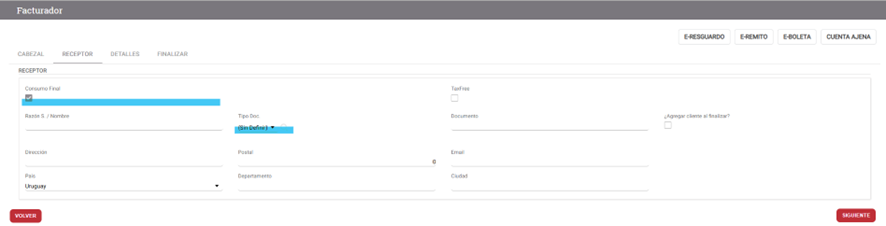 -E-Factura: En vez de marcar en Consumidor Final, seleccionar la lupa que aparece en “Tipo Doc”, se abrirá un buscador donde se debe digitar el RUT del receptor y luego seleccionarlo. El sistema traerá los datos directamente desde DGI. Luego de que aparezcan los datos dar a siguiente.